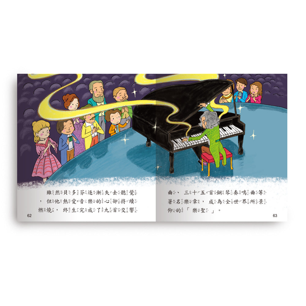 本書含<達文西>。<貝多芬>。<孔子>等6則偉人故事,故事情節簡單有趣,圖畫生動 活潑,隨書附內容音檔QR CODE,讓孩子容易閱讀之虞,也能體驗聽故事的樂趣,透 過故事讓孩子認識各領域偉大領導者們的生平背景,並讓孩子學習偉人們領導前 進的動力。