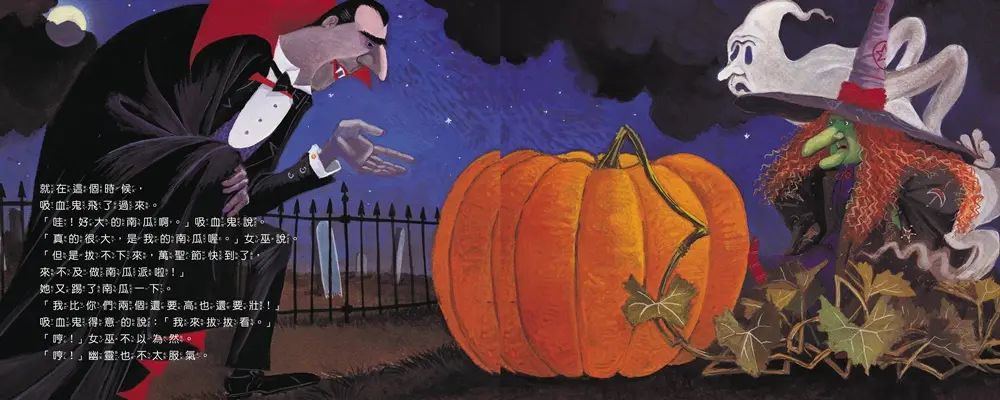幽靈飄過來,他看到如此大的南瓜,他用力再用力,但拔不起來;吸血鬼看到了,卻也無法拔起;木乃伊也來了,他同樣想吃香噴噴的南瓜派,但他也搬不動這又大又重的南瓜。看來萬聖節的南瓜派就要泡湯了,直到小蝙蝠出現,想出了一個辦法,拯救了這一切。