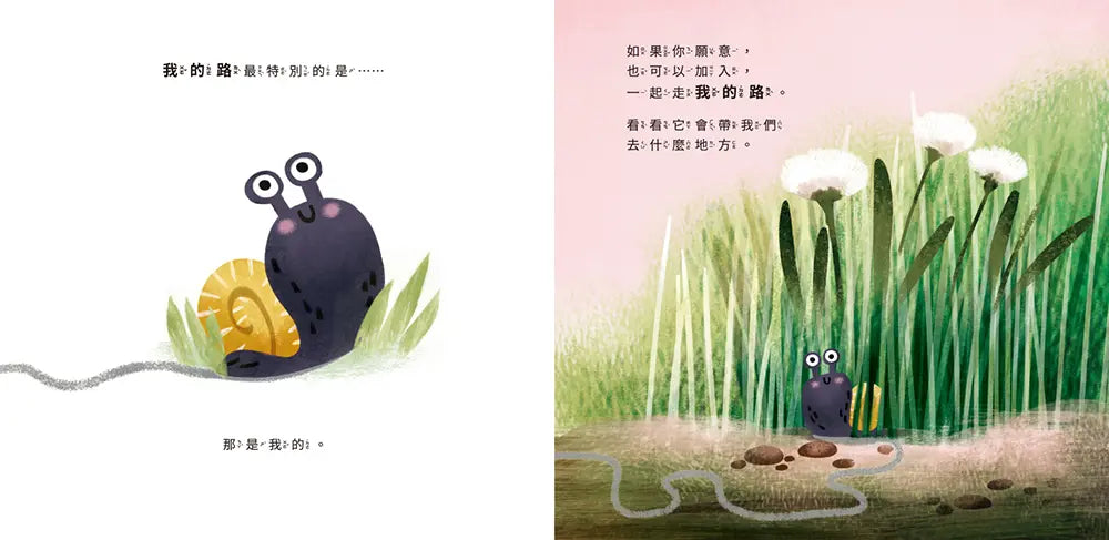 勇敢的小蝸牛,走上這些特別的路,愉悅的享受自己的選擇,文字簡潔,堅定又富含詩意;繪圖是小蝸牛行經的路線及風景,不同層次的綠和大地色系,呈現大自然的美景與自在自由。故事強調選擇自己的路並持續前進;找到自己獨特的人生道路,並且不忘初衷。