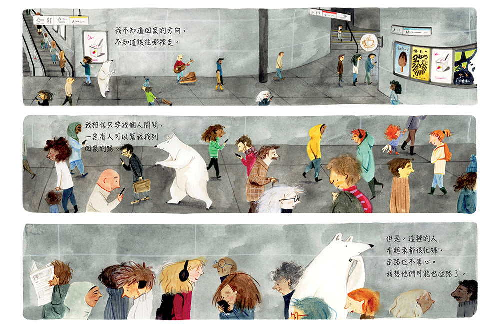 一波三折後,熊在地鐵上遇見了一個好心的小女孩帶他回家,小女孩幫熊洗澡、給他飯吃,還陪他一起念書,最後還幫熊找到回家的方法⋯⋯在這整個過程中,似乎只有小女孩看到了熊,連小女孩的媽媽也是一路滑手機,甚至不知道女兒帶了一隻熊回家呢!媽媽的反應,代表的也是大部分人類的反應。而,看見熊的困境的小女孩,也就是少數對保護環境議題有所覺醒的人吧!