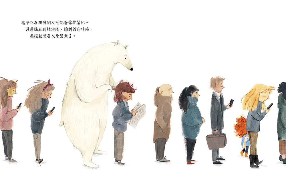 一隻熊迷失在水泥叢林城市裡,他想找人幫忙找路回家,卻發現城市裡的人忙得沒時間抬頭看他一眼。他在城市裡四處遊走,看到有人排隊就跟著排,結果是排隊買咖啡的,熊只得到了一杯難喝的咖啡;熊再到旅客服務中心想尋求協助,卻只拿到一張根本找不到北極的地圖。這一切的經歷,在在顯示出熊在人類世界裡的無助與無力,也隱喻著人類掌控著環境、卻無視熊的求助,冷漠地看著熊在險峻的環境裡自生自滅。