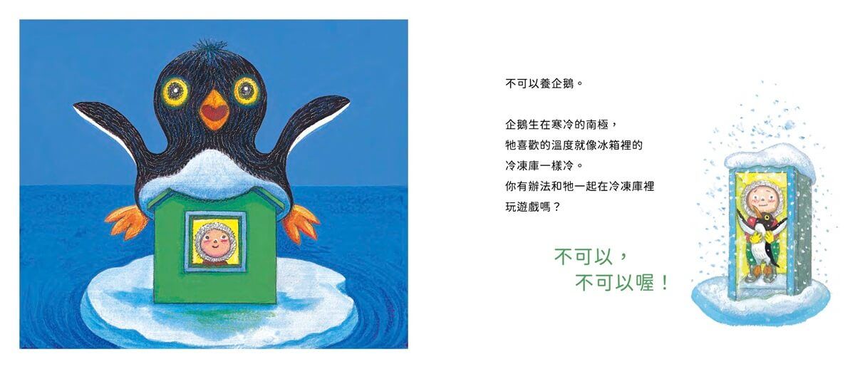 每個小朋友都有過異想天開、想把全世界的可愛動物都帶回家的願望,但這些動物不一定那麼「居家」,有的太大、有的太吵,帶出門可能很耀眼,帶回家卻會讓人眼神死。當媽媽說不可以,爸爸也說不可以,幾米用貼近孩子的角度跟孩子說,為什麼「不可以」!