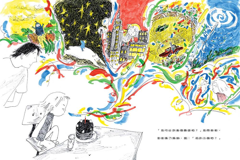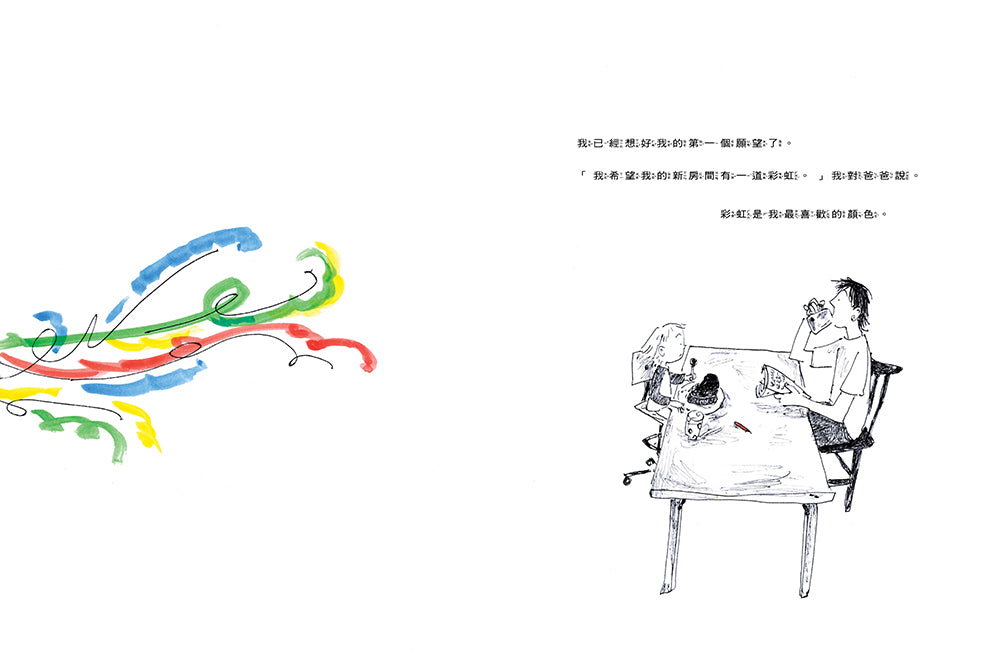 搬到新家,一切都是陌生的、不確定的。小女孩悶悶不樂, 很不習慣、有點害怕、有點擔心、看所有東西都不對,本來最喜歡吃的巧克力蛋糕,吃起來也是無滋無味的。爸爸為了安慰焦慮的孩子,說:「妳可以許願,再難,我都幫妳實現!」於是,小女孩的第一個願望是房間裡要有彩虹。爸爸畫了彩虹,達成願望。 第二個願望,想吃到世界上最大的披薩。爸爸做了披薩。 第三個願望,不喜歡星期四的泡澡日。爸爸宣布今天不是星期四!到公園散步,發現公園裡的溜滑梯好高,在心裡偷偷希望溜滑梯可以低一點。但是這樣的願望是不可能實現的。「爸爸,可以 再有一個願望嗎?這個願望是想回家,回舊家……」爸爸於是背起了小女孩,假裝乘車要回家了,事實是一趟又一趟的繞著新家走。小女孩很舒服地在爸爸背上昏昏欲睡,也得到了安慰。隔天一早,小女孩開開心心地吃早餐,一切又恢復了美好!因為,回家了……