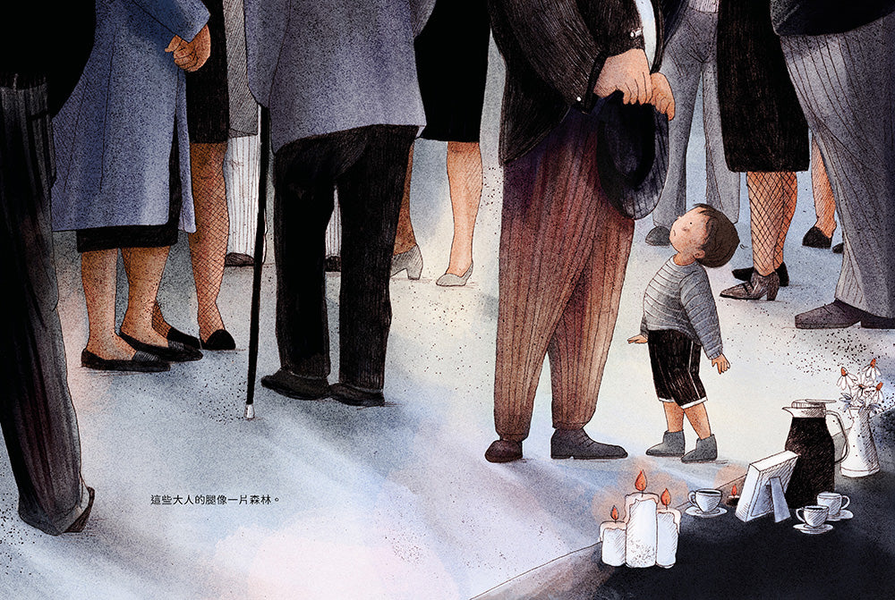 在爺爺的喪禮中,孩子懷念起爺爺,他說如果爺爺在這裡,一定會替他講一個關於大野狼的故事,並且學著野狼的嚎叫聲。在這裡,孩子以回憶和爺爺過往相處的點滴來壓抑悲傷。直到他看到奶奶和他一樣悲傷,這才哭了起來……