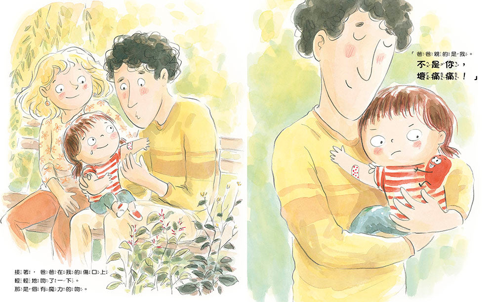 小女孩跌倒受傷了,手上有了一個很痛的傷口。媽媽第一時間飛奔過來幫她消毒、貼上OK蹦,安慰她還好不嚴重。爸爸很疼惜地在她的傷口上親吻了一下。 哥哥為她念了她最愛的故事書。乾爸帶她吃冰淇淋、奶奶摘新鮮的草莓給她吃,爺爺帶著她一起做蛋糕,好朋友來陪她玩,甚至連家裡的狗狗都跑過來溫柔地舔了舔她的臉頰,雙眼望著她,好像是在說:「我把妳的痛痛趕走了。」……身邊所有人都以各自的方式安慰她,讓她忘記了跌倒受傷的痛。
