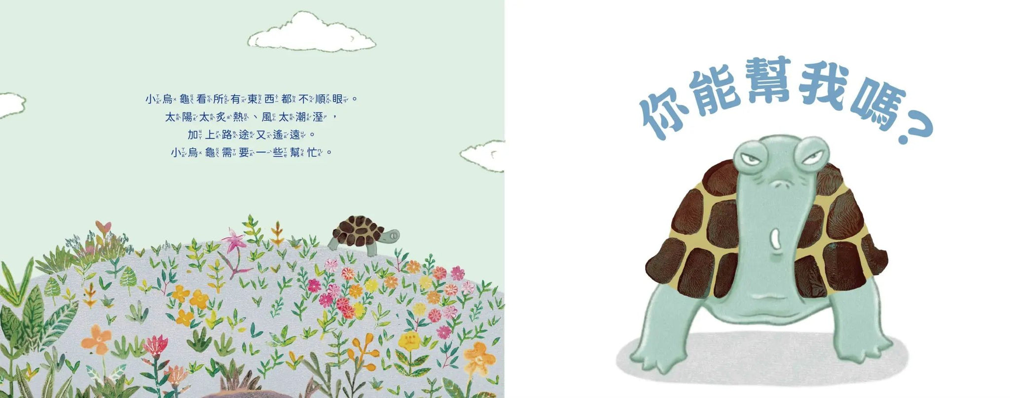 ★故事中,小烏龜一開始習慣抱怨、嫌棄,每到一個新動物身上就喊「停!停下來!」這些誇張又真實的抱怨語氣,不只讓孩子覺得好笑,也點出「抱怨無法解決問題」的核心。