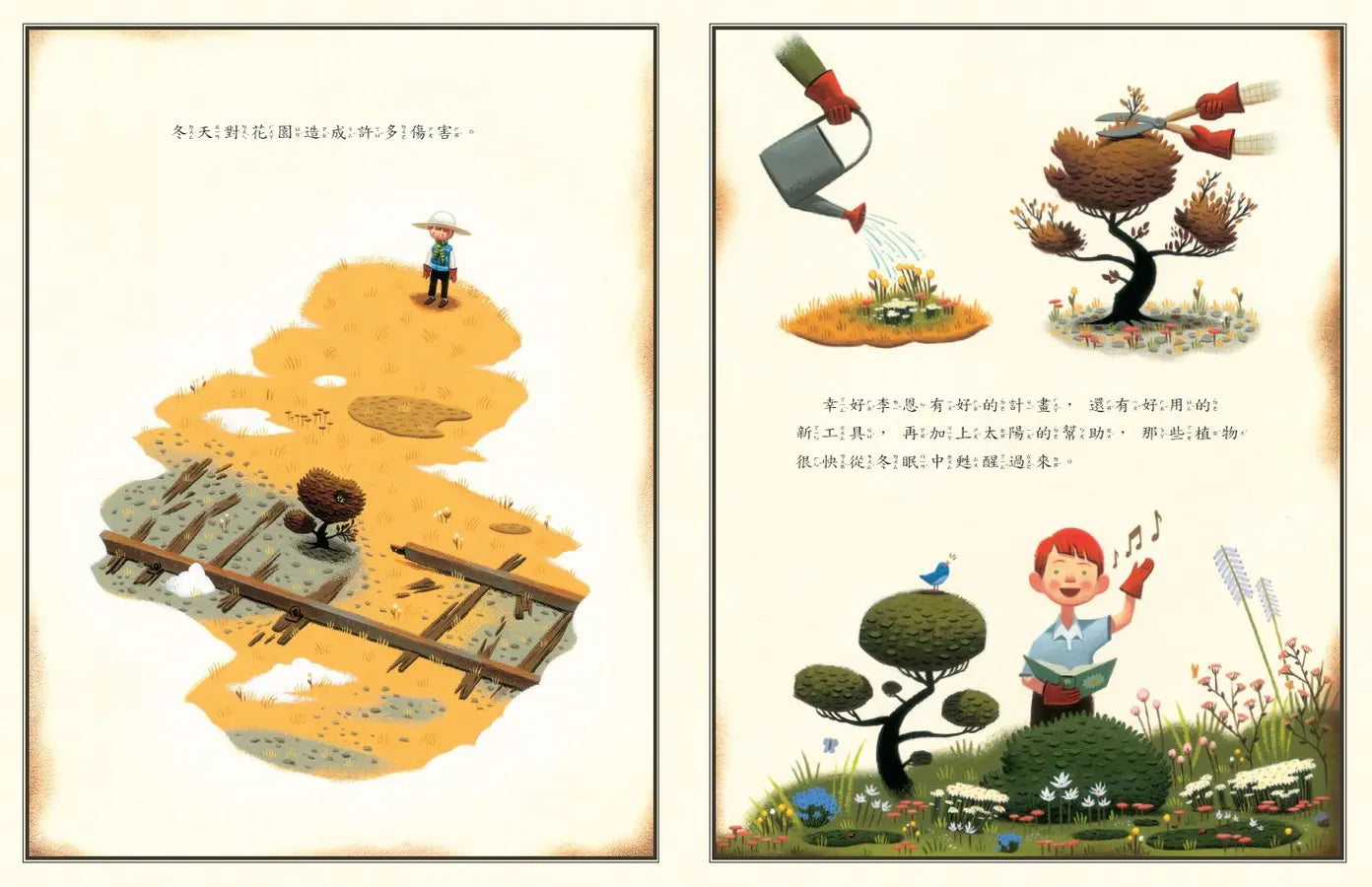 ▲擬人化的「花園」,就像一群活潑好奇的小孩,隨著花園不斷延伸,畫面愈來愈生動,不但可以比較城市改造前後的不同,也可以尋找前面場景發生在城市的哪個角落,還有紅髮李恩出現每一頁的什麼地方,這些都為閱讀增添了更多樂趣。