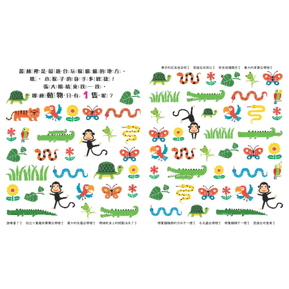 本書共有12個有趣主題,156個好玩互動遊戲,帶領孩子想一想、找一找,看看哪種動物或物品「跟其他不一樣」?不僅訓練觀察力、培養專注力,更能提高邏輯思維能力,學習數字、形狀、顏色等基礎認知。