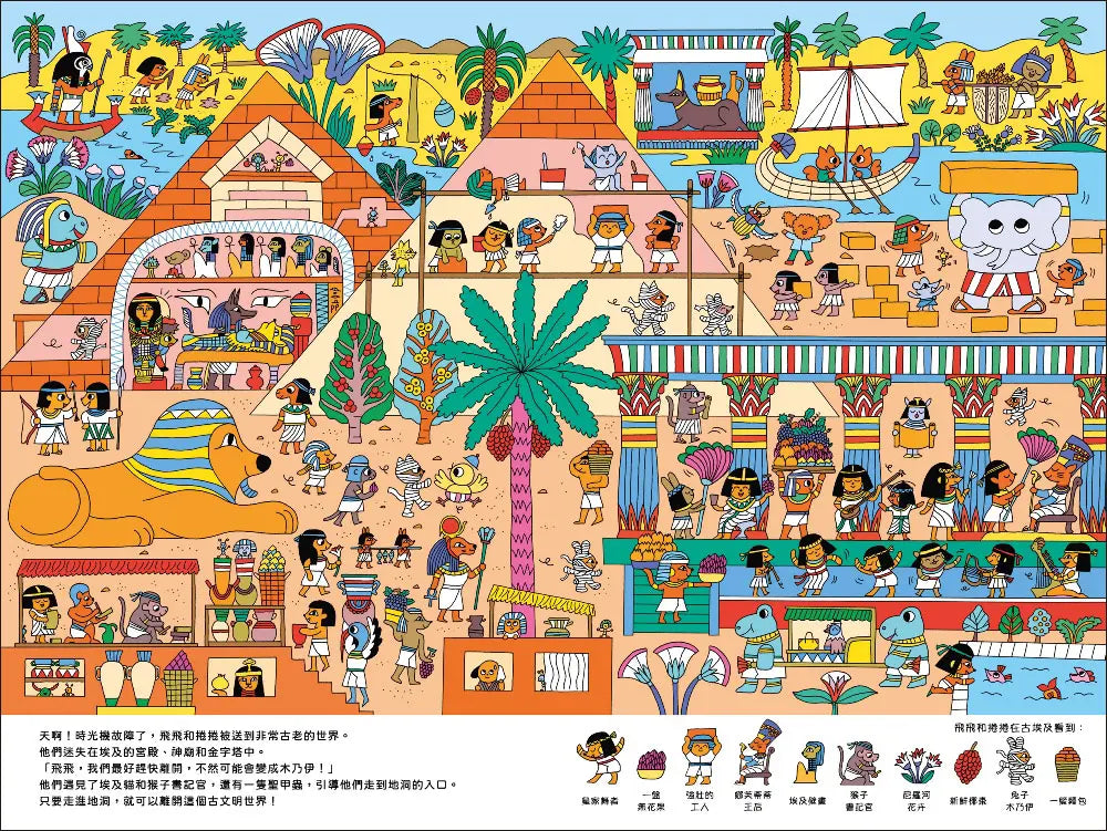 故事中的場景彼此呼應——在天文館搭上火箭,下一站來到外太空;接下來被吸進黑洞,來到未來世界;當他們搭上時光機準備回家,竟陰錯陽差去到神祕古埃及;在地底洞穴土裡藏著恐龍化石,果然下一站就來到恐龍大草原……圖畫中隱藏的線索讓閱讀更有趣,也讓孩子更期待下一頁的驚喜!