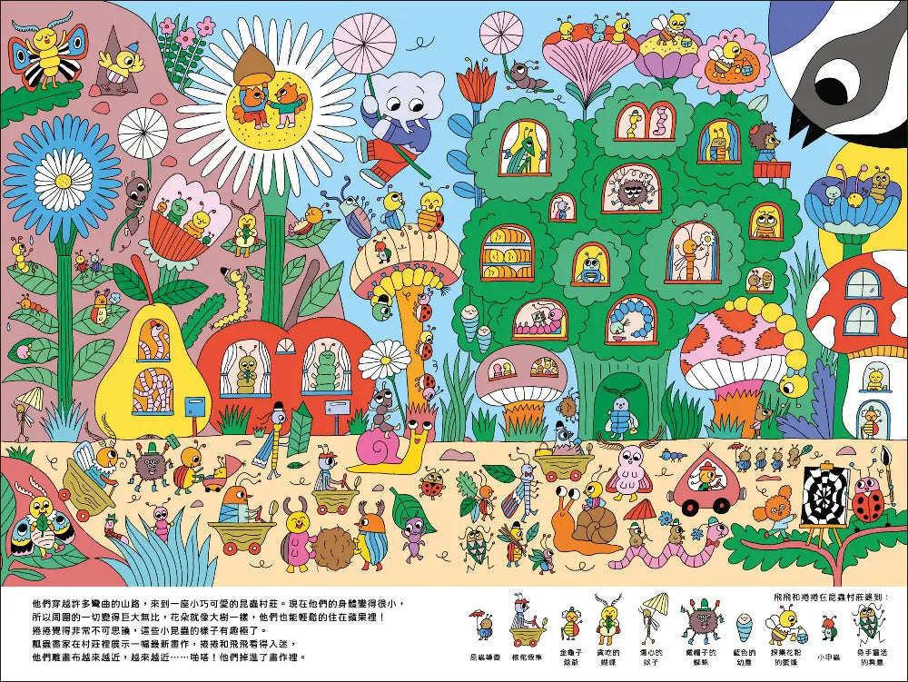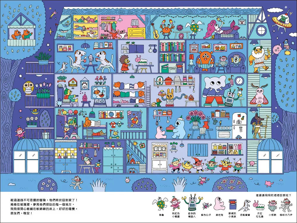 除了尋找指定物件,孩子也能透過觀察圖畫,發現隱藏的角色,創造屬於自己的故事。譬如童話世界裡有三隻小豬、薑餅人、穿長靴的貓…還有誰呢?最後,當飛飛和捲捲終於回到自己的家,舒舒服服的躺在被窩裡回味一整天的奇遇。可是故事還沒完呢,一路上的奇妙生物也跟著他們回家,你發現了嗎?
