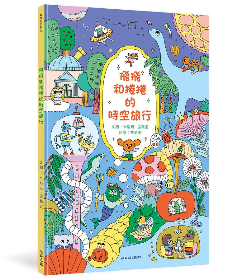 故事設計是以「穿越時空、場景跳躍」的方式展開,每一頁都是一個全新的世界,從熱鬧的街道、奇幻的恐龍大草原,到五彩繽紛的海洋世界。大人可以鼓勵孩子專注觀察,並說出自己的發現,譬如街道上有書店、咖啡廳、公車站;在外太空可以看見地球、火箭、外星人;或是在昆蟲村莊裡,可以看見螞蟻、毛毛蟲和蚯蚓……透過親子共讀,孩子也能得到許多趣味認知。