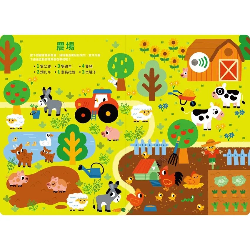 本書收錄48種的聲音,按下音效鍵即可清楚地聆聽到多種東西發出的聲音,像是拖拉機發動、乳牛哞叫、公雞啼叫等,一次認識生活中各式各樣的東西,並提升聽覺辨識能力。