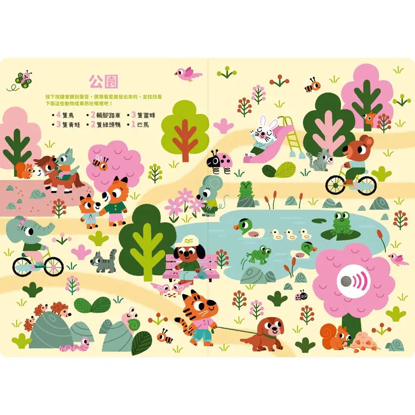 本書除了讓孩子從畫面中尋找目標,還加入了聲音互動遊戲!每一頁都能按下按鍵,播放隨機聲音,小朋友可以先觀察圖畫,再聆聽聲音、猜猜是誰發出的,接著在圖中找出正確的位置。從隨機播放遊戲中,再次提升孩子的專注力、觀察力、耐心,還能學習解決問題的能力。