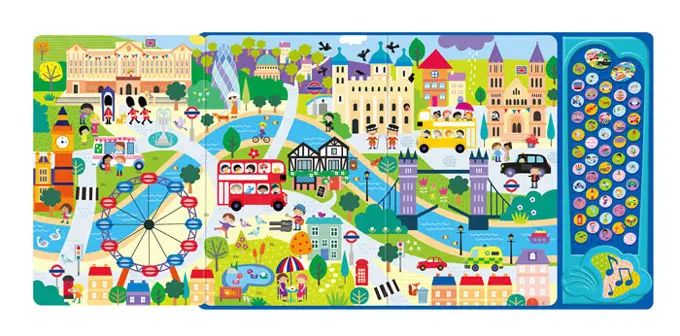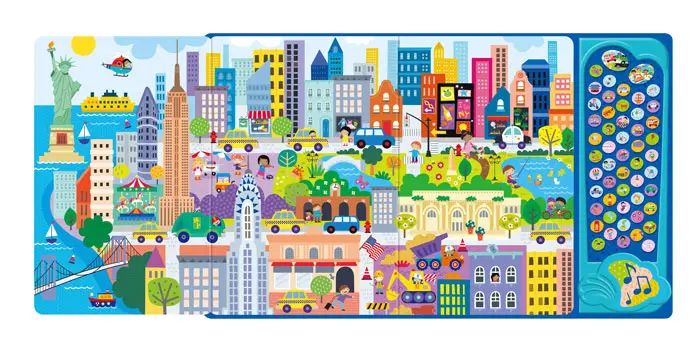 本書不只是音效書,也結合了「找找看」的遊戲!先觀察每個場景的10個代表性元素,再打開折頁,從超大、超豐富的各個城市街景中找出這10個東西,不只培養小朋友的專注力、觀察力、耐心,還能學習解決問題的能力,讓孩子邊聽邊玩,樂在其中!