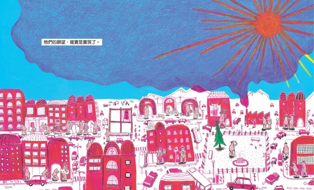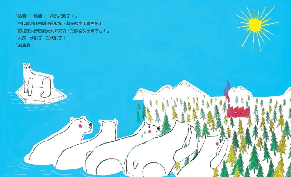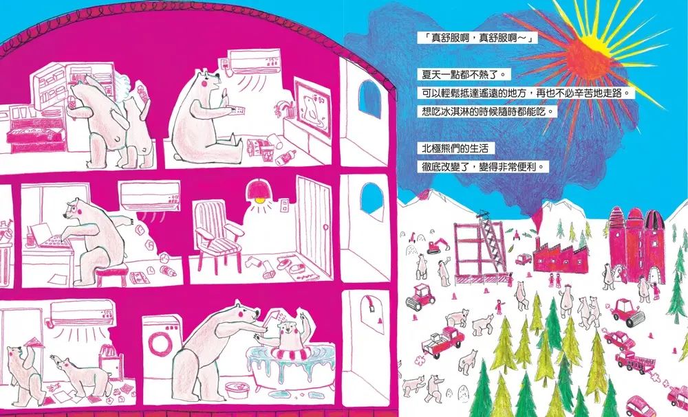 從此,北極熊的各種願望無論是「希望冰淇淋不會融化」「不想要老是長途跋山涉水」……也都用工具逐一實現了。但是工具和工廠大量排放的粉紅色煙霧,卻讓冬天變得不再寒冷、海冰消失,連北極熊原本潔白的毛色也都變成了粉紅色……這究竟是怎麼一回事呢?