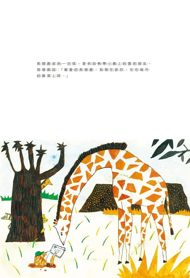 長頸鹿收到穿山甲郵差送來的一封信,信是來自遠方熱帶小島上的雲豹。長頸鹿想:「城市?那是什麼樣的地方?雲豹那麼大又那麼重,要怎麼住在屋頂上呢?」長頸鹿實在太好奇了,也很想見見他的朋友,於是決定出發去找雲豹。