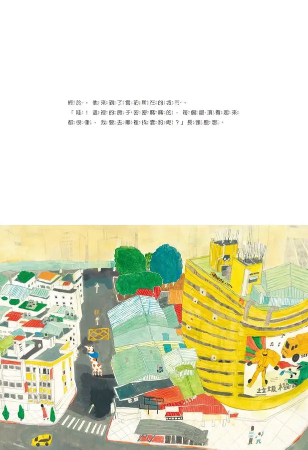 長頸鹿搭著小船,千里迢迢、飄洋過海來到這座熱帶小島,並且到了雲豹所在的城市。但是這裡的房子密密麻麻的,每個屋頂都很像,他要去哪裡找雲豹呢?