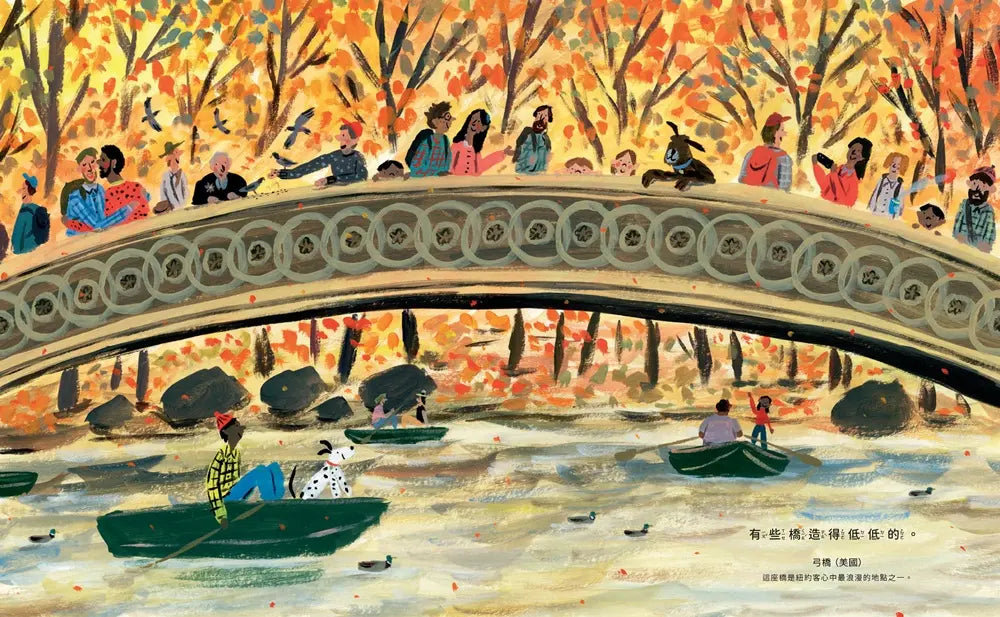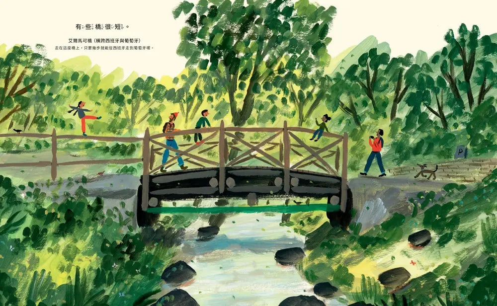 法國新銳插畫家馬克.麥耶斯基,以寬闊線條與明亮色彩描繪橋梁風景,搭配簡潔而富詩意的文字,讓孩子在欣賞畫面的同時,自然吸收地理、生態與文化知識。