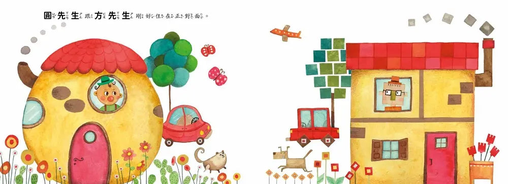 2. 排版設計極具創意:圓先生總是在左邊,方先生總是在右邊,兩人的中間總是會出現一些物件,讓他們意見相左。有一天他們之間沒有隔閡時,兩人的看法竟然產生了變化。