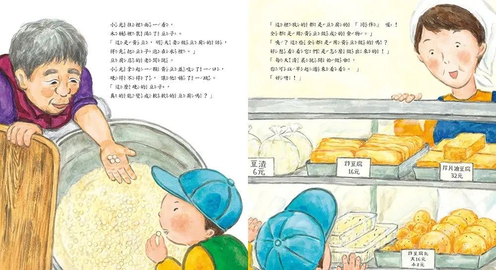 一目了然,讓孩子看圖就能理解黃豆如何變成豆腐,連製作豆腐的機器都畫得相當真實具體。從食材的來源開始,到成為食物上桌後的變化,清晰明瞭的展示給孩子看。讓孩子從頭了解一種食物的生產過程,開拓孩子的視野,提升認知概念。進而尊重與感謝製作食物的人,並學習珍惜食物。