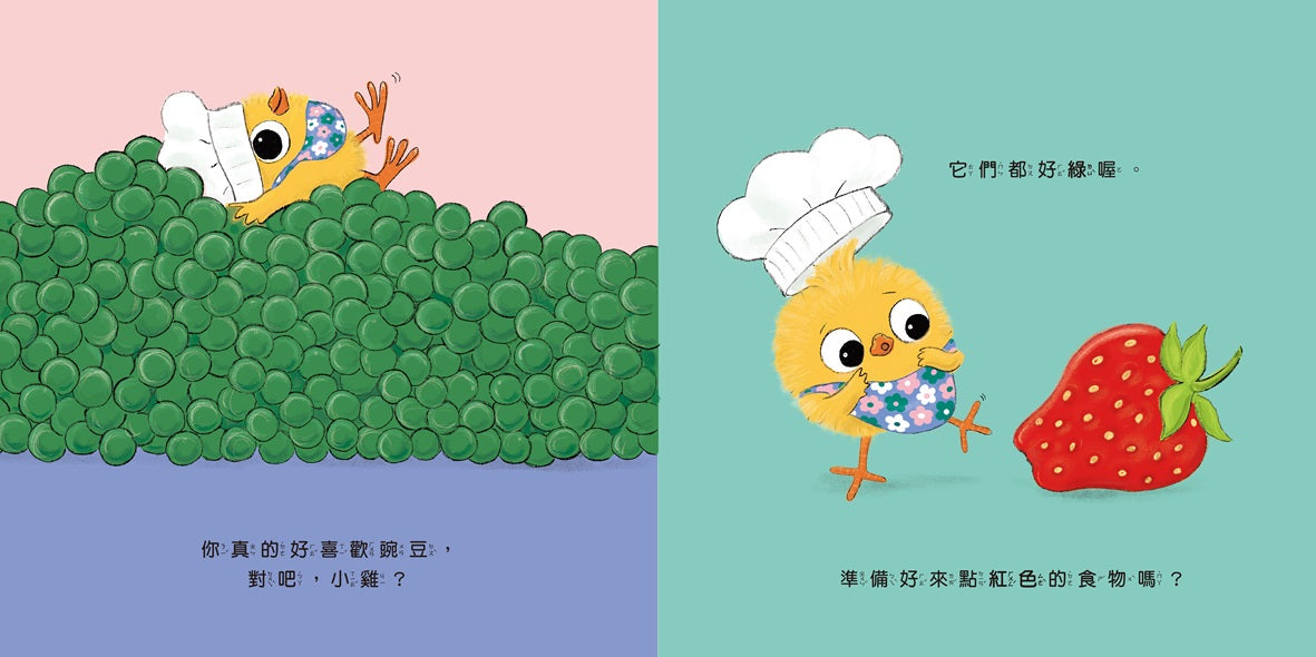 哇,小雞!有好多豌豆呀,你喜歡綠色的食物對吧?