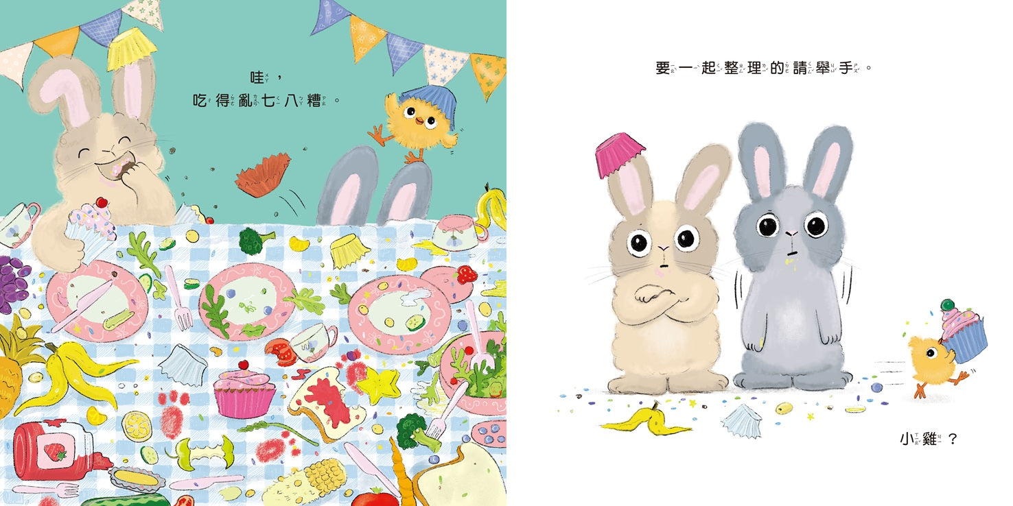 哎呀,吃得亂七八糟的。我們一起收拾乾淨吧!