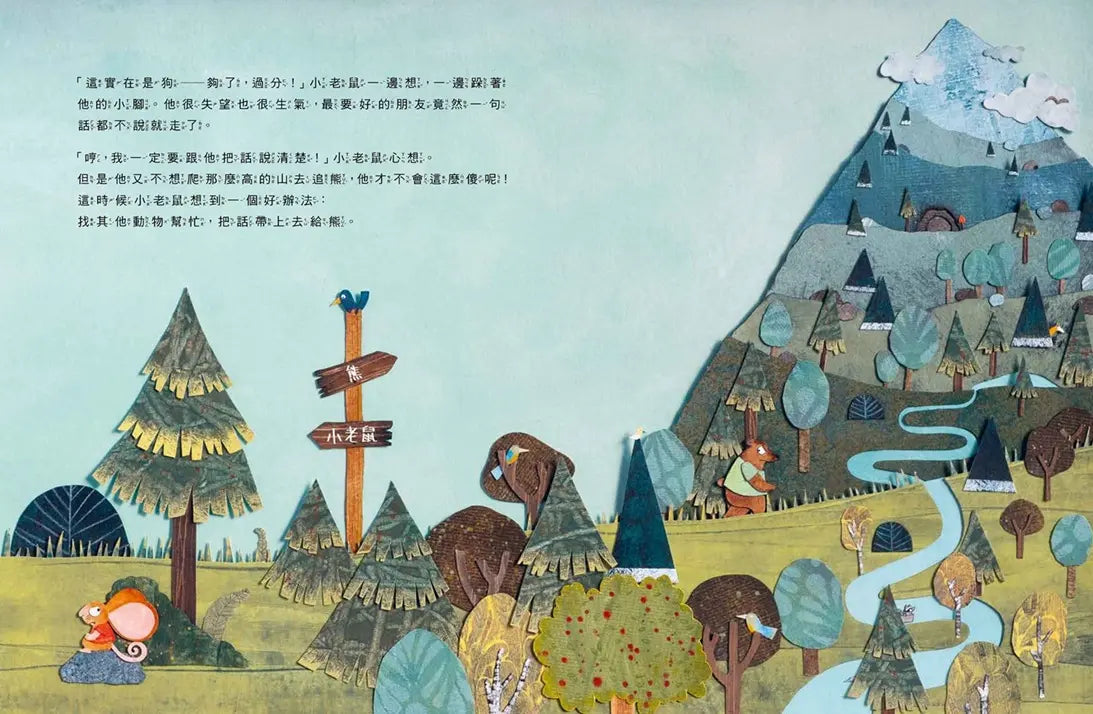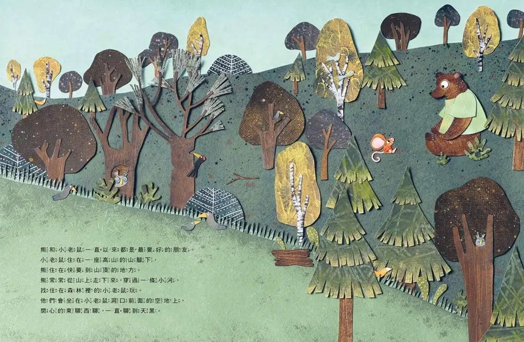 ★從河邊到山頂,紙片與水彩及壓克力拼貼出具豐富層次的森林系繪本。