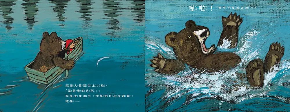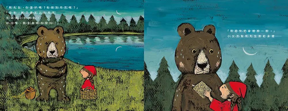 熊先生與小女孩在相互陪伴的過程中,都因為得到了慰藉與滿足而展開笑顏,彎彎如月的嘴角和眼角,和他們尋找的月亮相呼應,如此的設計巧思讓人驚豔不已。