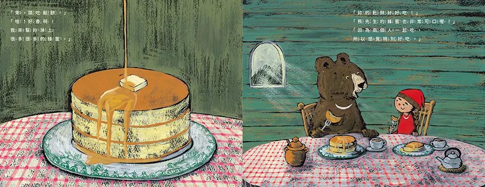 此繪本由昏暗的森林場景拉開序幕,深沉濃郁的色彩,讓人感受到熊先生的孤寂與沉悶。但隨著故事的發展,不僅景色逐漸明亮,熊先生的嘴角也逐漸上揚。