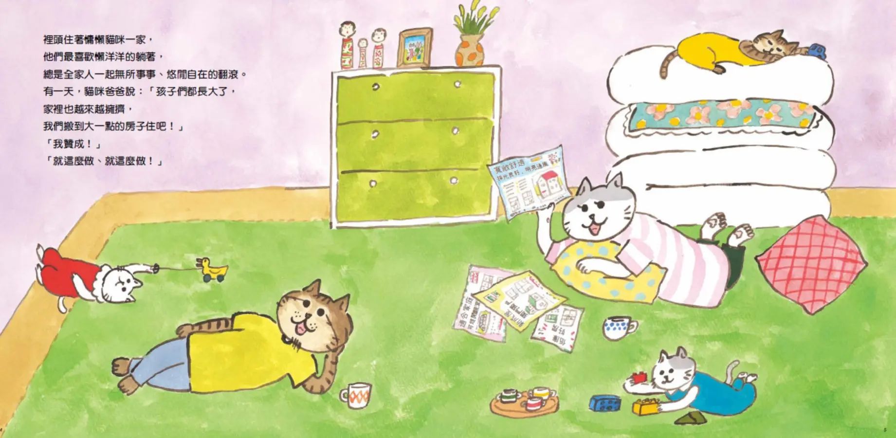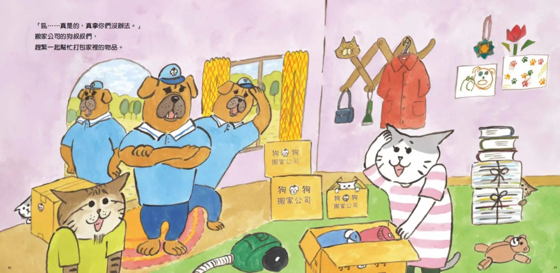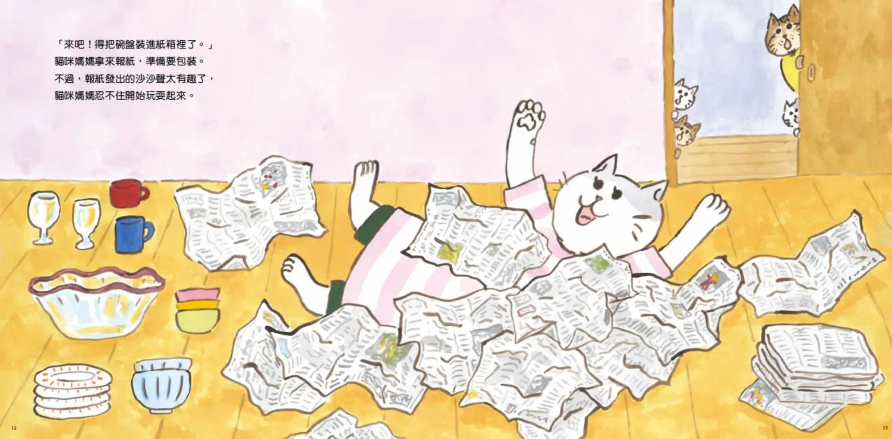 ◆隨著故事情節發展,看著貓咪一家邊玩邊休息邊打包,不知道哪時候才會把行李打包好,直到最終搬家公司來了,全家人才開始認真收拾的動作,像極了日常生活中,拖延到最後一刻才開始動作的人們。