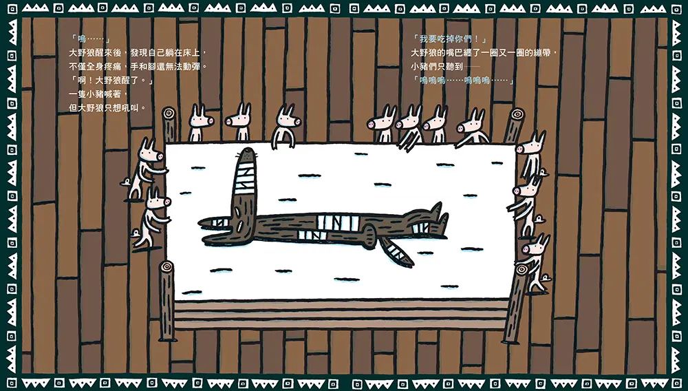 「我要吃掉你們!」大野狼吶喊著,但他的嘴巴纏了一圈又一圈的繃帶,小豬們只聽到「嗚嗚嗚……嗚嗚嗚……」的聲音。