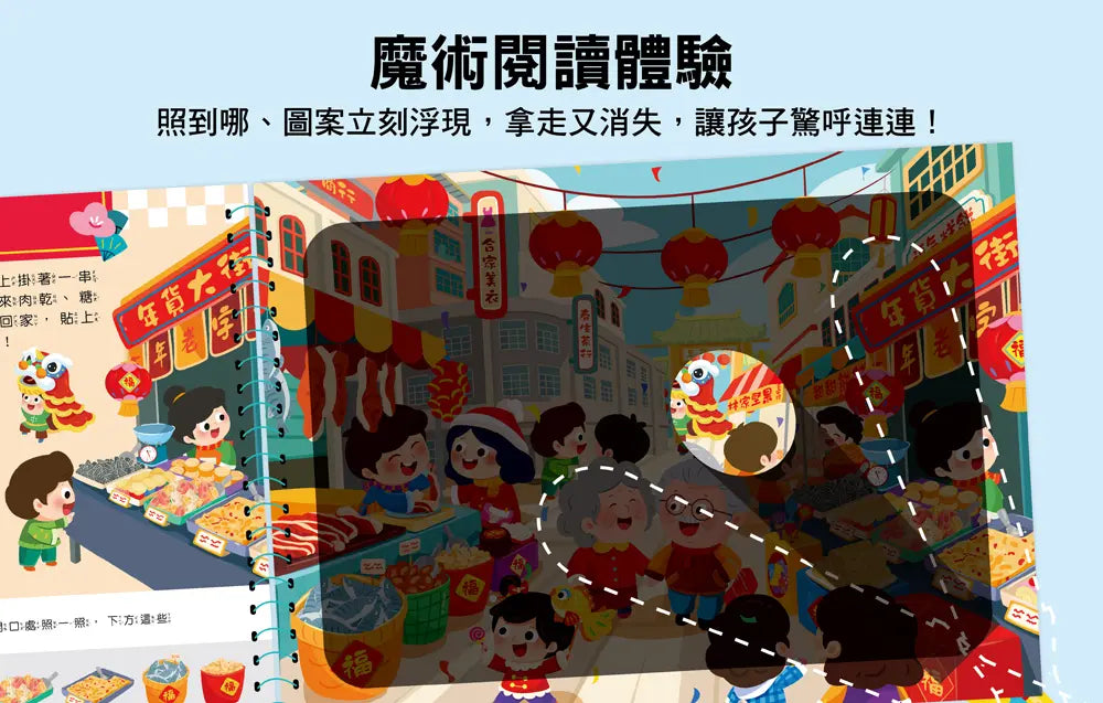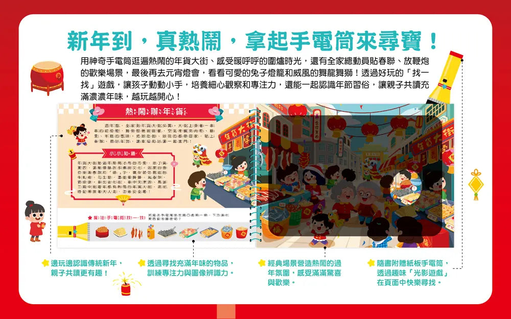 拿起手電筒,準備一起探索熱鬧的新年街景吧!結合光影找一找的互動玩法,只要用隨書附贈的紙板手電筒照一照,原本看不見的圖案立刻浮現,移開後又會消失,給孩子帶來驚呼連連的閱讀驚喜。書中以熱鬧的新年場景為主題,融入年節習俗、街市風景與生活認知,在遊戲中培養觀察力、專注力與閱讀興趣,是適合親子共讀的互動遊戲書。