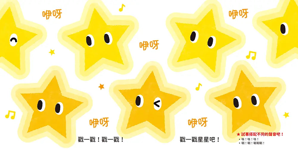 顧名思義,這是一本用來「拍打」的繪本。打開書本,等著你的是不同顏色、大小、排列的圓形,還有方形、三角形、星形和心形等,它們有著多變的表情:大眼、瞇眼、眨眼……加上各種大小、排列的變化、組合,一個個彷彿在呼喚著:「來拍我吧!」