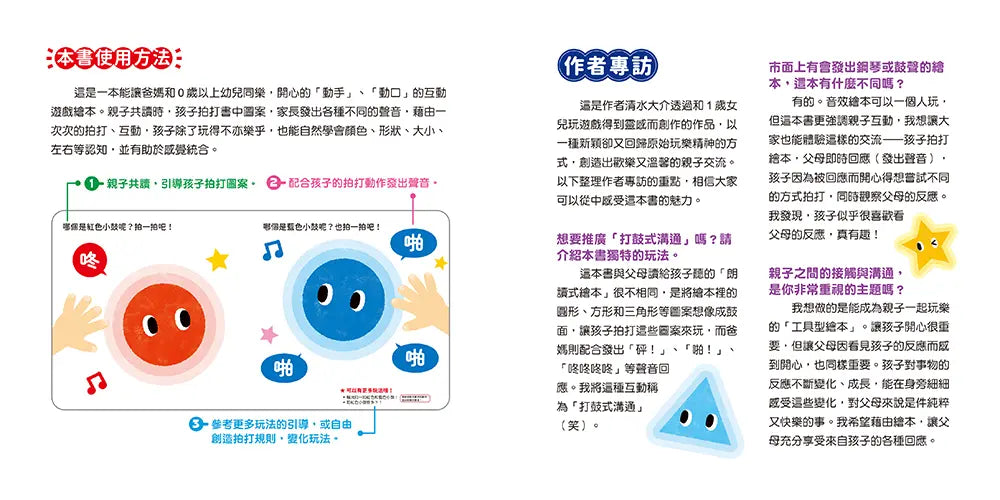 如果孩子尚不滿1歲,那麼,家長可以試著先「讀」這本「聲音」遊戲書給他聽,因為孩子對父母的聲音會覺得熟悉與安全感,也可以邊讀邊握孩子的手去拍打書中各式各樣的「鼓」,並發出不同聲音;當孩子年紀大一點,就可以運用創意和孩子「共讀」,享受有聲勝無聲的快樂!甚至,讓孩子自己發出聲音,想要什麼聲音,由孩子自己創造!