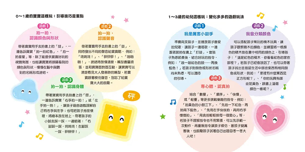 是的,請把這些圖案都想像成小鼓、大鼓或是某種樂器,引導孩子拍一拍或敲一敲,比如:「找到紅色小鼓拍一拍」、「輪流拍一拍藍色小鼓和紅色小鼓」、「大力拍大鼓,小力拍小鼓」、「從小鼓拍到大鼓」、「按一按三角形」、「戳一戳星形」、「摸一摸心形」、「依照紅色、黃色、藍色的順序拍一拍」、「用最快的速度拍一拍」等,當孩子做出指令的動作,家長也得接著做好「音效師」的工作,努力發出「砰」、「咚」、「啪」、「轟」、「啵」、「咻」等各種聲音。
