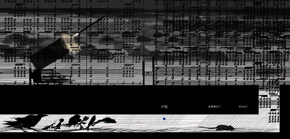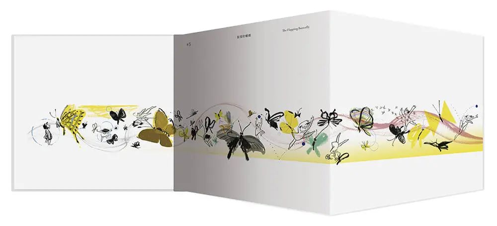 而頁面上那顆陪伴著小女孩前進、玩耍的小圓球,都特別以燙黑處理,同時內頁還有局部鏤空⋯⋯等繁複加工,最終的故事高潮處更是有著「讀者必須用手展開」才能看到完整風景的巧妙設計。可以說本書的做工精緻無比、細節無處不在。Suzy Lee高明地拓寬了讀者對紙本書物理性質的認知,也讓人對她作為一位「書籍藝術家」的想像有了更進一步的認識。要能感受本書的動人趣味和印刷裝幀工藝,一定要親手翻閱實體書。