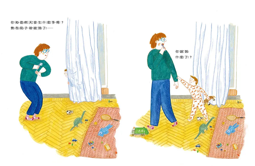 小男孩立刻露出頭來,拉著爸爸的手,眼睛亮晶晶的問:「你聽到什麼了?」
