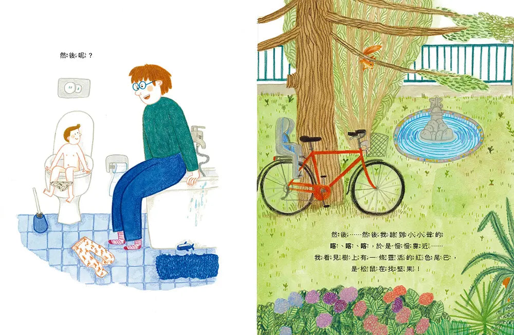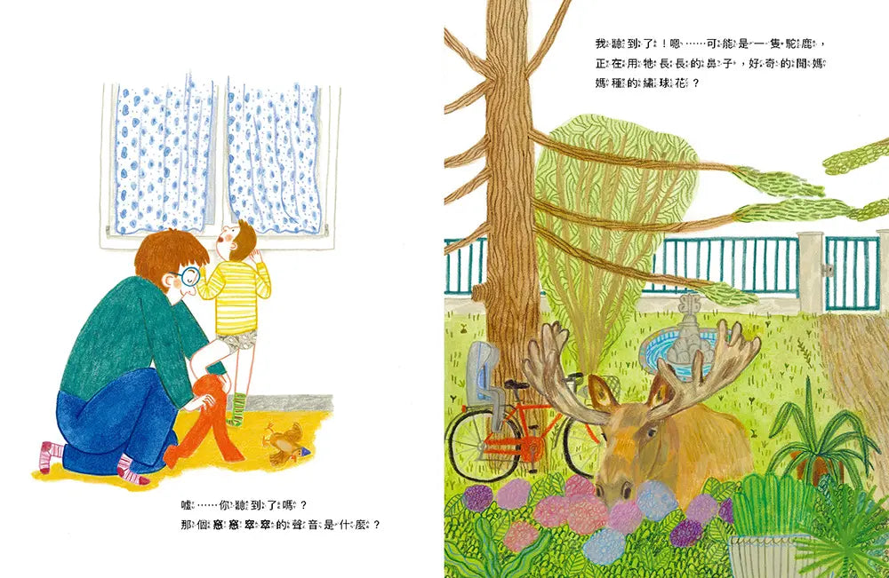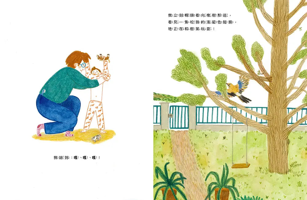 故事以聲音為起點,他們聽到院子裡有「嘎嘎嘎」的叫聲傳來,看見淺藍色的翅膀在樹枝間晃動,發現是松鴉正在和樹葉玩耍,接著「喀喀喀」的聲響出現,紅色尾巴一閃而過,松鼠正忙著在樹上找松果。每個聲音都帶來新的動物,父子之間的對話也隨之展開。