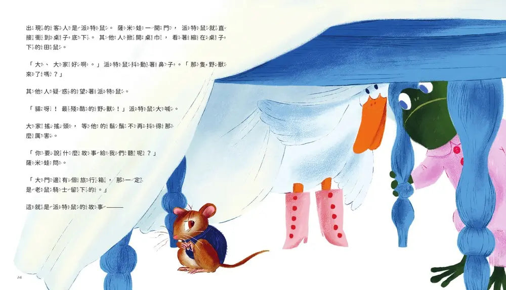 達莉鴨一到,就指著薩米蛙家門外的大旅行箱,興奮地展開她的故事;蝴蝶小布緊接著加入,說那是精靈王子的箱子;派特鼠、河狸瑪莉、蝸牛瓜瓜也迫不及待闖進來,把旅行箱化作勇士寶物、奇幻冒險的起點……每個動物都用自己的想像力,為那個神祕的箱子編織出一段又一段精彩的故事。
