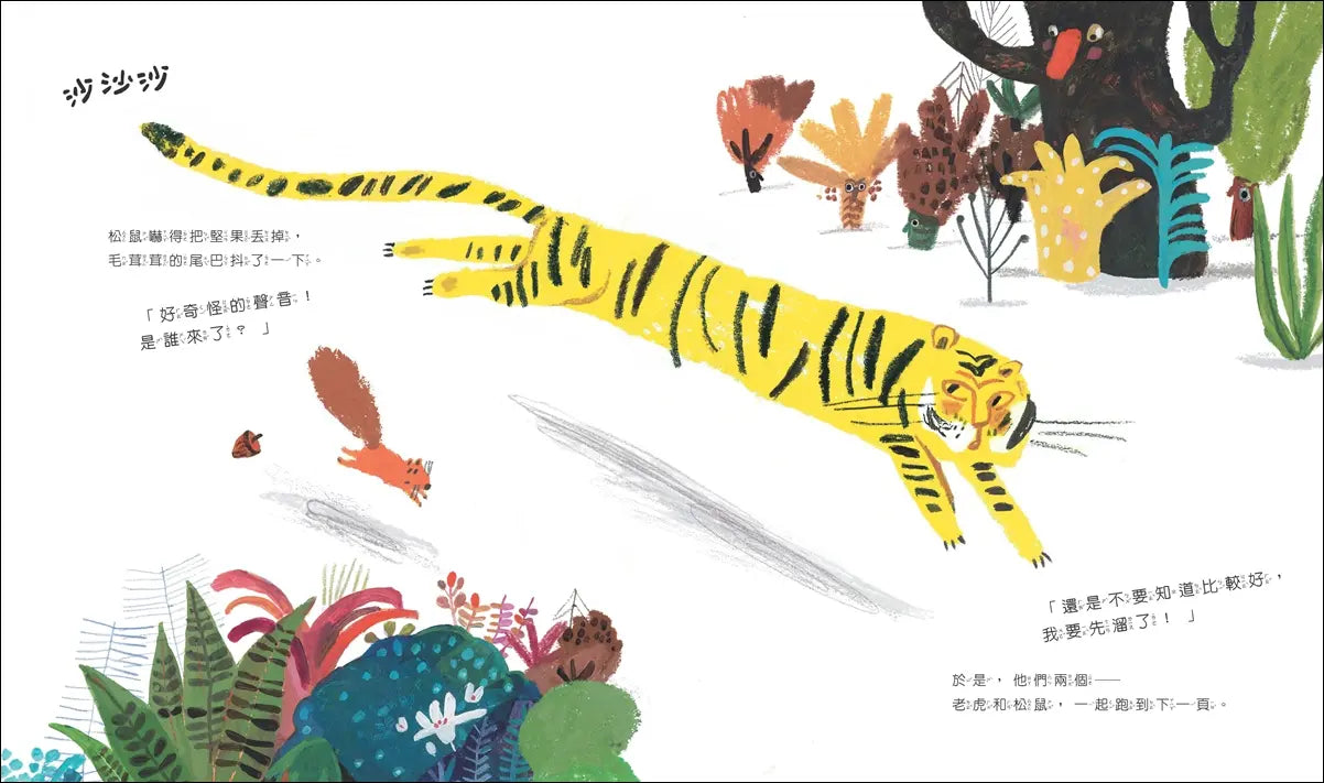 老虎從午睡中驚醒,松鼠嚇得丟下堅果,他們開始逃跑……