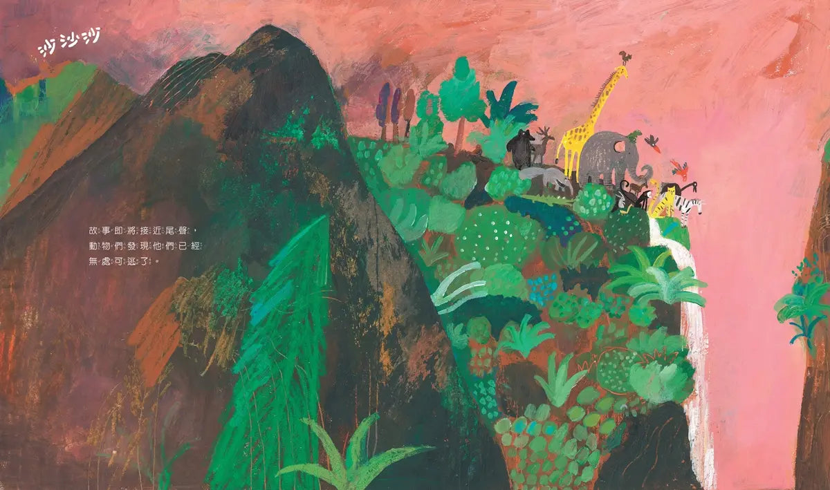 動物們結伴同行,隊伍的人數不斷增加。他們翻越山嶺、躲進山洞、跳入河流,試圖逃離那個一路緊追不放、闖進來的人。