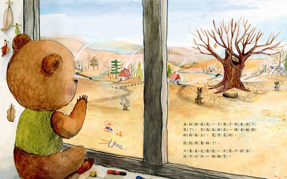 故事主角小熊聽說,當森林裡最後一片葉子落下時,看到它的人可以許願。