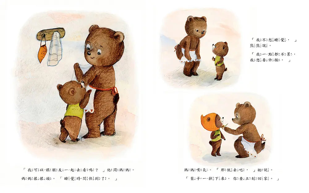 ◆小熊的動物朋友(刺蝟、花栗鼠等)一開始也陪著他,隨著時間流逝,一個個回家休息。