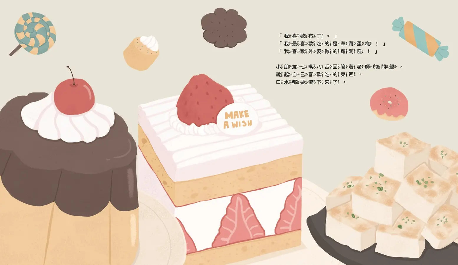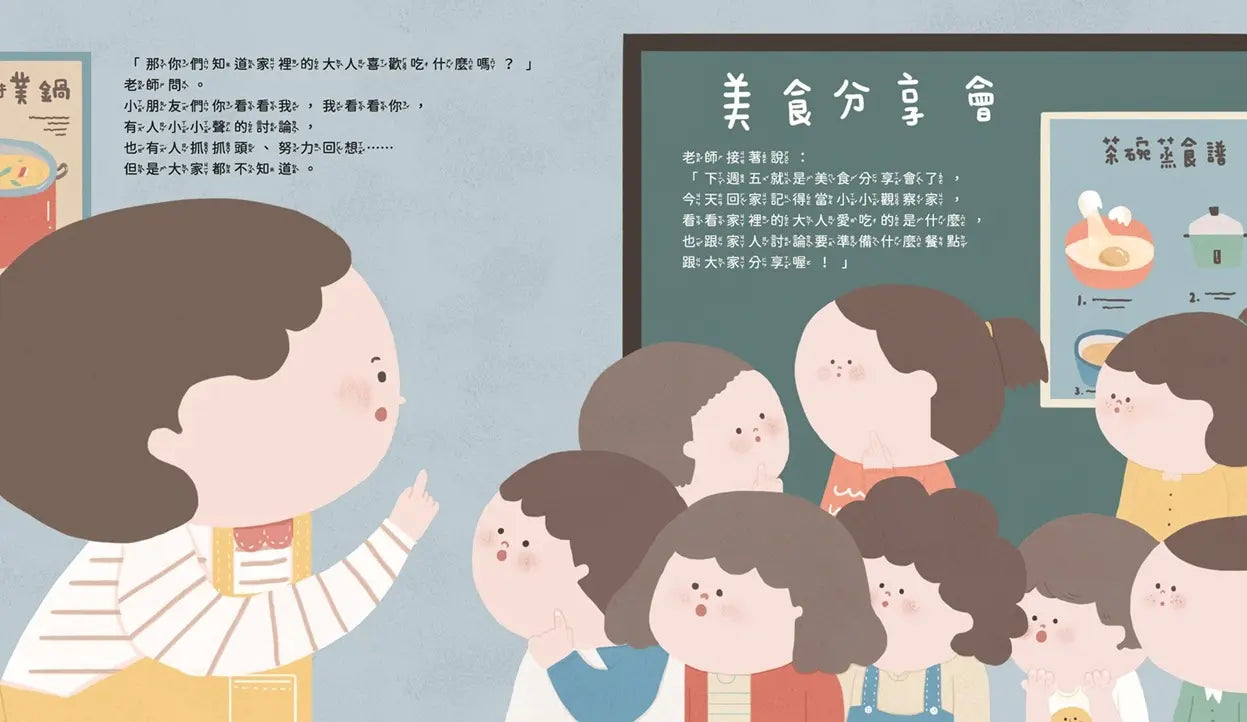 老師問小朋友們。小朋友們對自己喜歡吃的蛋糕、布丁等等再清楚不過了,但是大人們到底喜歡吃什麼呢?老師請大家回家觀察,並且一起討論週五的美食分享會要帶來分享的食物。孩子們回到家後發現,大人們喜歡吃的東西真的跟自己不一樣!媽媽喜歡吃魚頭、舅媽喜歡吃披薩邊、爸爸喜歡吃芒果籽……這些東西真的有那麼好吃嗎?經過老師解說,小朋友們才知道,原來爸爸媽媽總是把最好的留給孩子,食物裡面藏著很多大人們的愛!到了週五這一天,每個家庭都帶了一道菜來分享,這次,換孩子們將最好吃的那一口放在盤子裡,端給大人們享用!