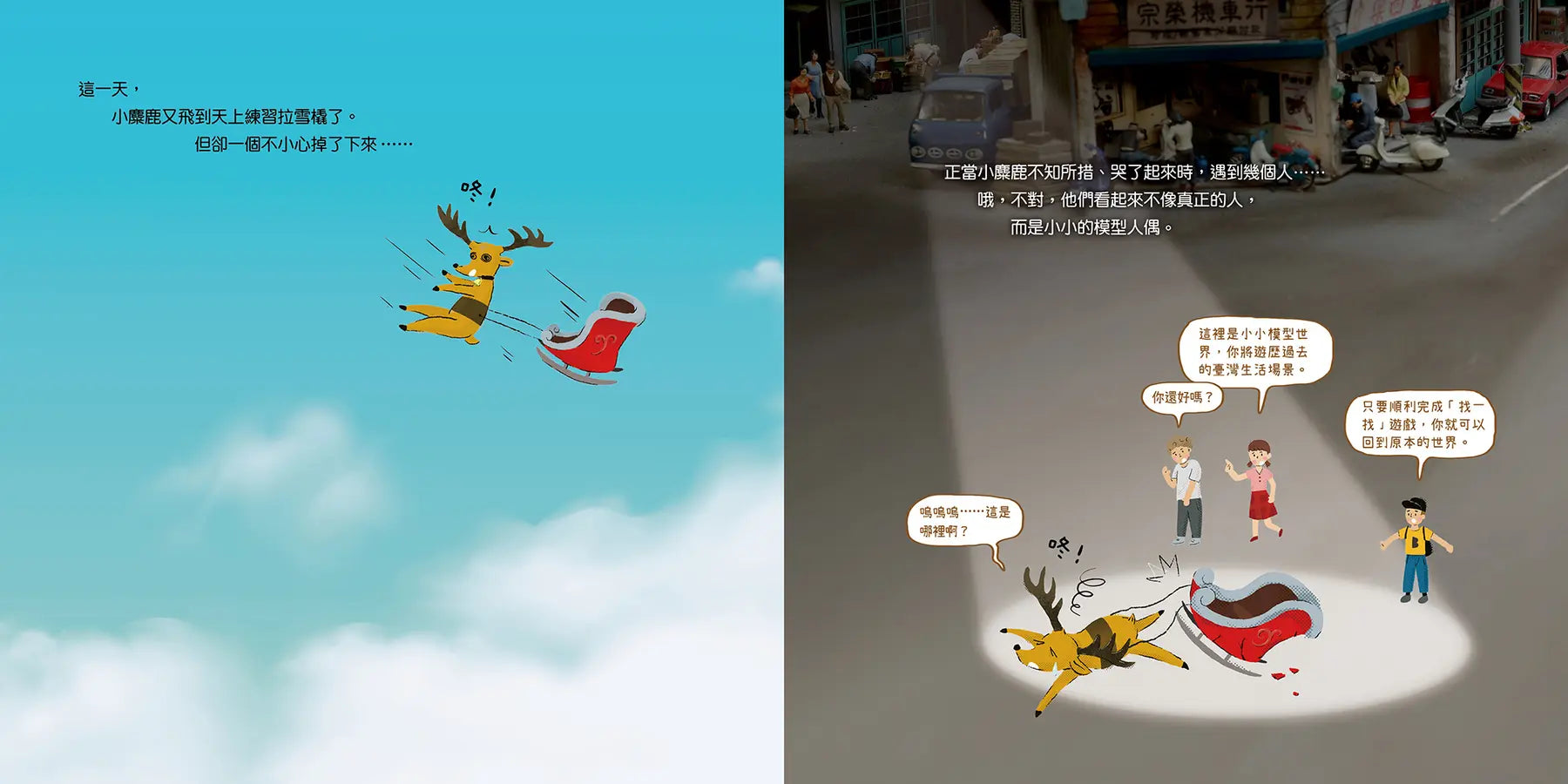 模型小人偶告訴小麋鹿,這裡是回憶裡的小小模型世界,他將會遊歷過去的臺灣場景,只要順利完成各種「找一找」遊戲,就能回到原本的世界。